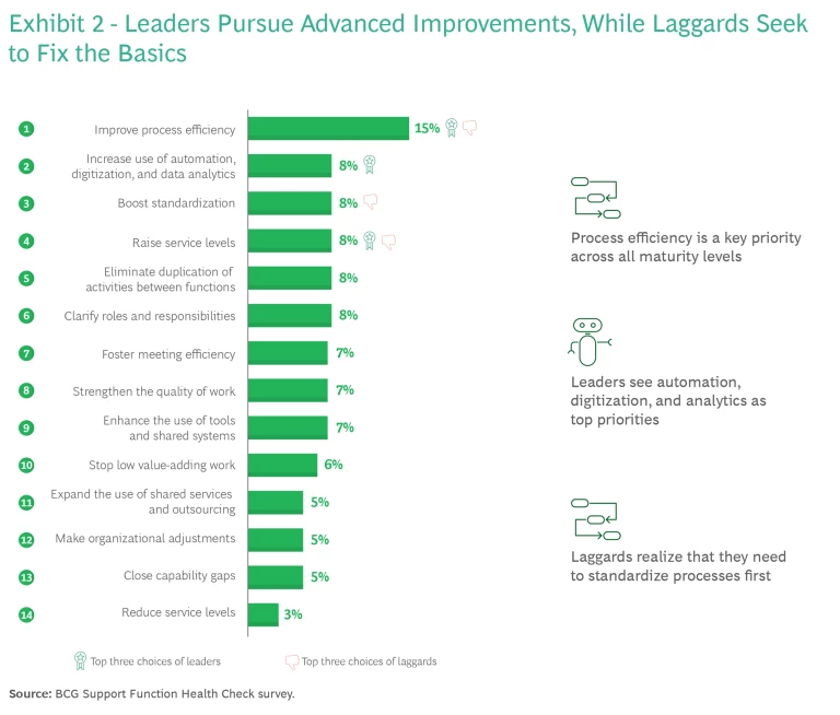 Respondents identified process efficiency, digitization and automation, and standardization as their priority levers for improving support functions. In addition, the respondents agreed that a rise in service levels is important, yet secondary. A notable difference emerges when we analyze the responses of the laggards and leaders separately. (See Exhibit 2.)