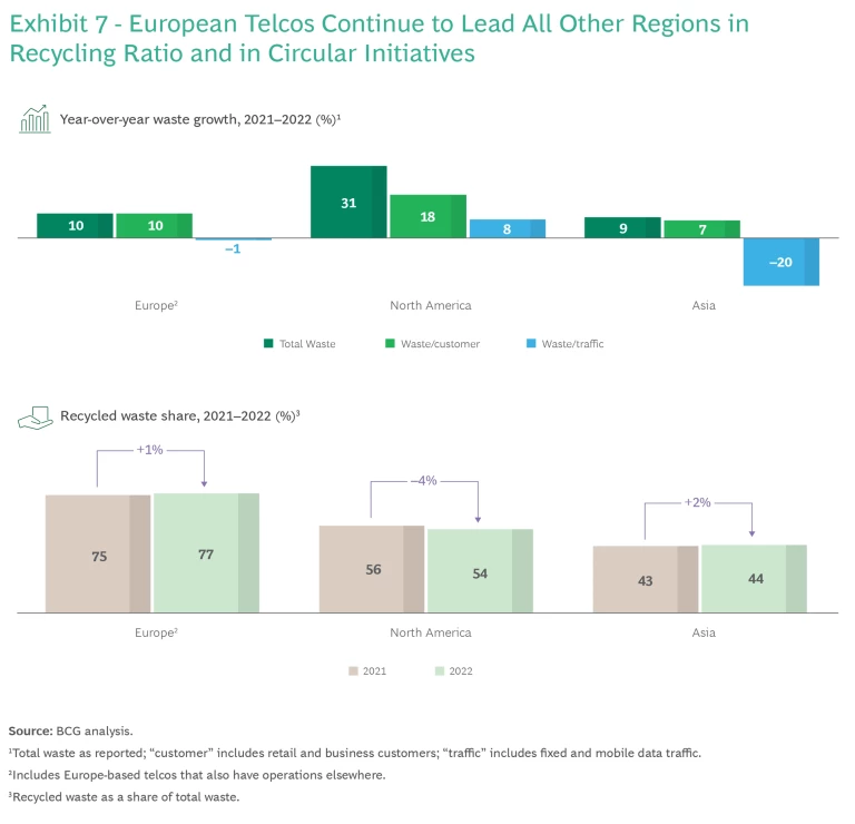 Even so, the industry’s overall score in this dimension increased by 5 points, primarily as a result of telcos becoming more aware of the circular economy and raising their customers’ awareness of it as well. Operators are also expanding device takeback programs and lessening total waste intensity, including waste-to-revenue and waste-to-customers. (See Exhibit 7.)