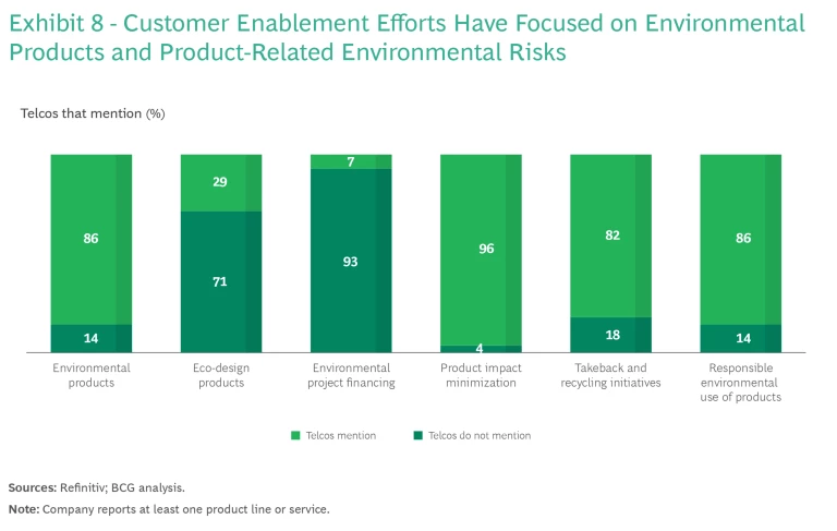 Nevertheless, this dimension saw the largest year-over-year increase of the four we track. More operators than ever before are reporting on enablement metrics and are increasing the number of environmentally relevant products and services in their portfolios. In fact, 86% of telcos included their environmental product portfolios in their reporting, and 96% mentioned efforts to minimize the environmental impact of their products. Despite these positive developments, further transparency is needed to determine the real contribution to sustainability of telcos’ products and portfolios. (See Exhibit 8.)