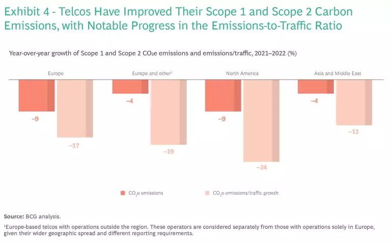 Therefore, it is encouraging that absolute Scope 1 and Scope 2 emissions within the industry declined overall in 2022. North American telcos led in year-over-year reductions, while their peers in Asia and the Middle East achieved more modest reductions. When considered in the light of their increased business activities, the result are even more encouraging: emissions intensity declined in proportion to the increase in data traffic over the past year. (See Exhibit 4.)
