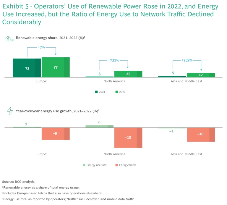 The decline in Scope 2 emissions is largely due to how operators sourced their energy needs. The percentage of energy obtained from renewable sources went up considerably, especially in North America, where it increased from 3% to 25%, and in Asia and the Middle East, where it rose from 5% to 17%. And while absolute energy use increased slightly, energy use as a function of data traffic decreased substantially. (See Exhibit 5.) This is largely a consequence of network improvements, including the transition away from legacy networks and the move to more energy-efficient technologies such as 5G. In addition, deploying enhanced network sensing and monitoring equipment has enabled operators to better manage their networks’ energy demand and peak consumption.