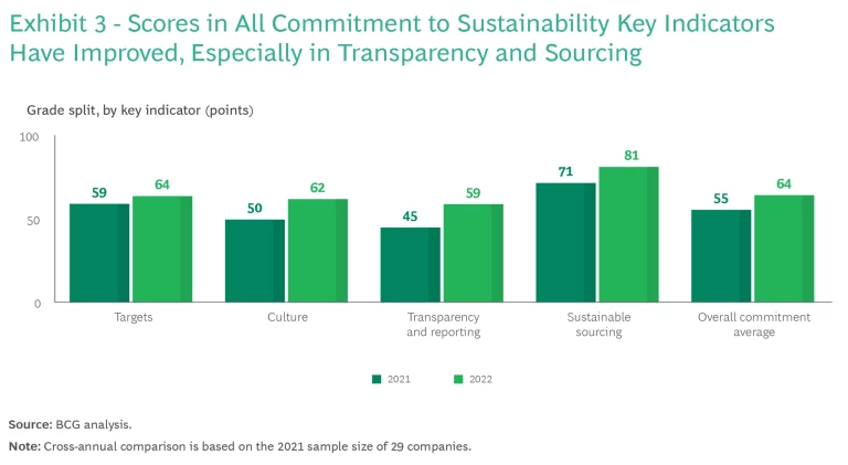 - External Commitments and Targets. Scores improved in this subcategory in part because select early targets were reached, leading to the creation of new, more aggressive targets. In addition, many operators issued targets for Scope 3 emissions and created targets for circularity and waste. Some companies also improved the actionability of their targets by sharing additional insights on how they planned to achieve them.