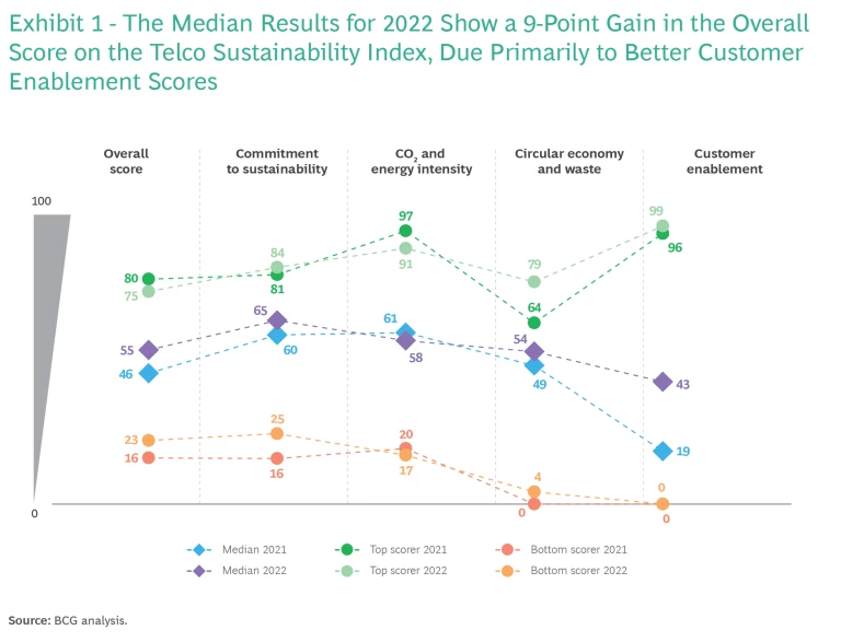 Progress, however, has been mixed. The telecom industry’s overall median score improved by 9 points in 2022 over the previous year. (See Exhibit 1.) But scores on three of the four main dimensions of the index did not show equivalent gains. (See “How We Create the Index.”) Median scores for commitments to sustainability and for circularity and waste management improved by 5 points, while efforts to reduce emissions and emissions intensity actually worsened by 3 points. In fact, the advance in overall score is largely due to a very substantial 24-point gain in customer enablement—and despite this achievement, the industry as a whole still needs to improve in this dimension.