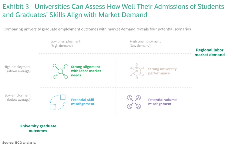 Universities can use BCG’s Graduate Employment Outcomes Matrix to identify misalignments of graduate volume or skills with labor market needs.
