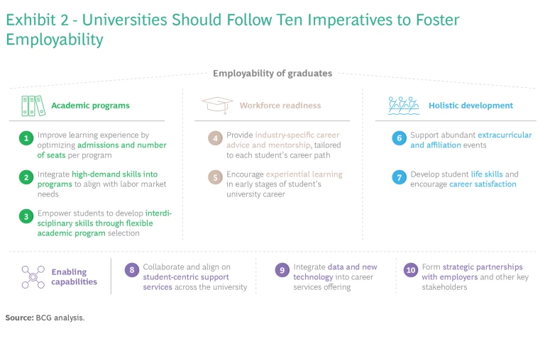 A BCG study of the employability initiatives of 23 universities worldwide reveals that these institutions excel across four major topics: academic programs, workforce readiness, holistic development, and enabling capabilities. These major offerings encompass ten imperatives that universities must act on to align the graduates’ skills with the demands of the modern labor market and thereby maximize employability. (See Exhibit 2.)