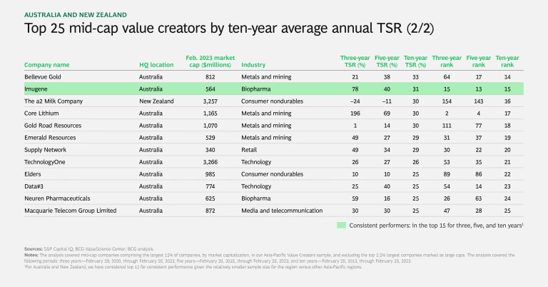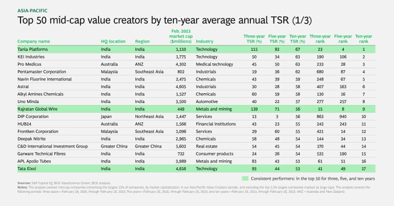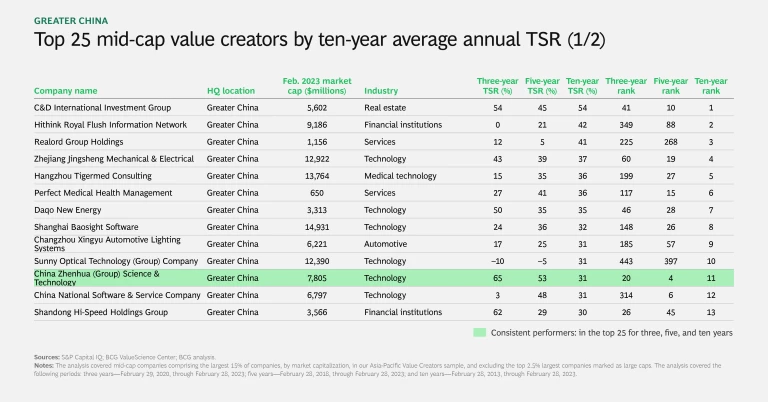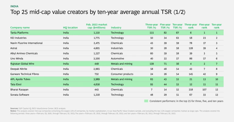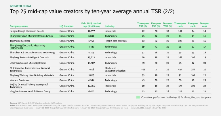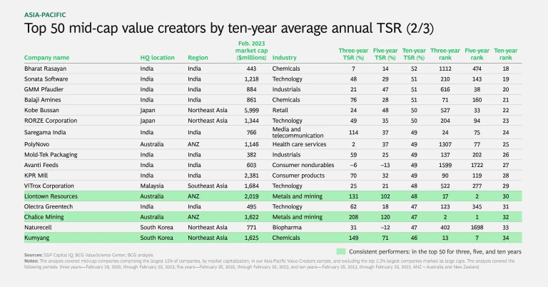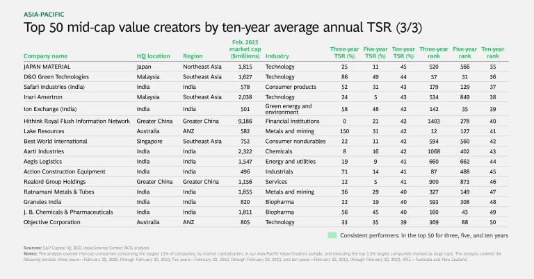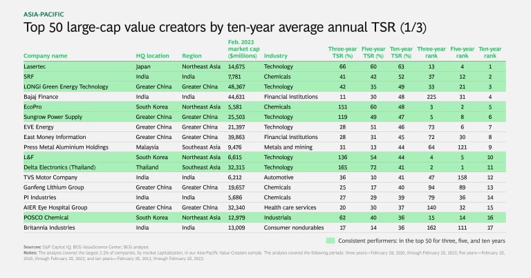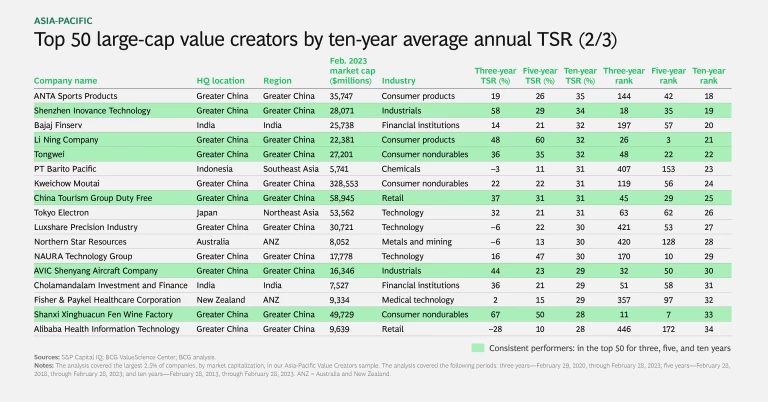Among the top 50 companies, 44% are based in Greater China, 22% in India, and approximately 10% to 12% each in the other Asia-Pacific regions. Eighteen companies have been in this elite group consistently—over periods of three, five, and ten years. The industries with the highest representation among these 18 companies are technology (6), industrials (3), consumer nondurables (3), and chemicals (2). Other sectors with a considerable presence in the top 50 are financial institutions, metals and mining, and retail.