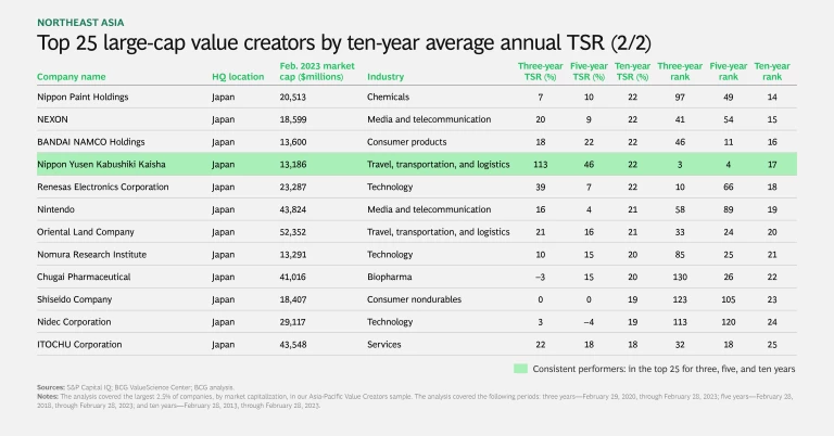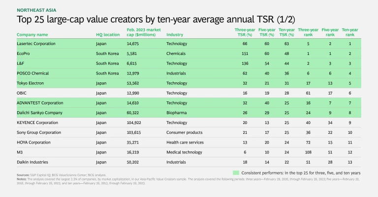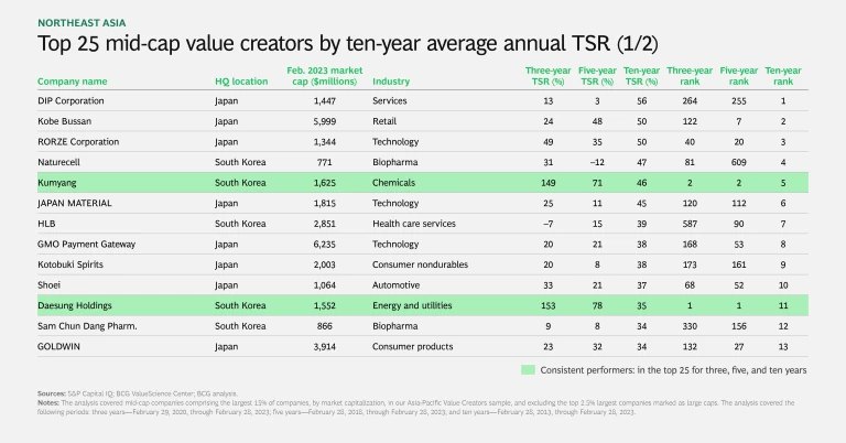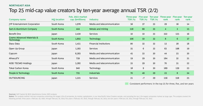 Northeast Asia. Companies in Northeast Asia had a ten-year average annual TSR of approximately 9%, resulting from a relatively balanced combination of revenue growth, margin improvement, and payouts. This $7 trillion market had more than 1,200 companies with more than $500 million in market capitalization, which is slightly higher than a decade ago.