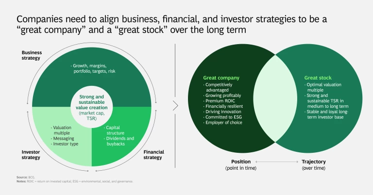By viewing their business from the shareholder perspective, executives can better align management decisions with the achievement of value-creation outcomes. It is not enough to be a great company with a strong competitive advantage, growing profitability, and achieving a premium return on invested capital. A company must also be considered a great stock that delivers on shareholders’ expectations over the medium to long term.