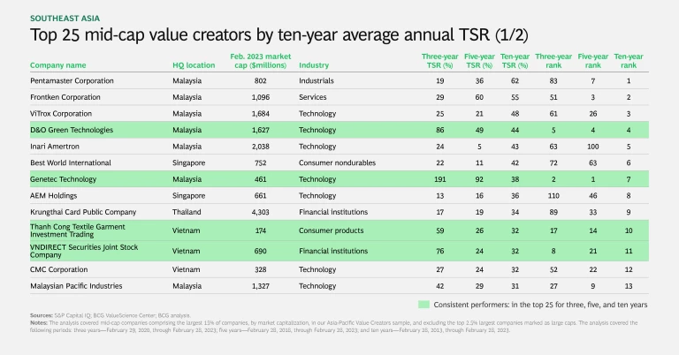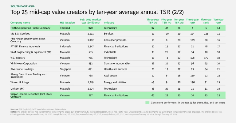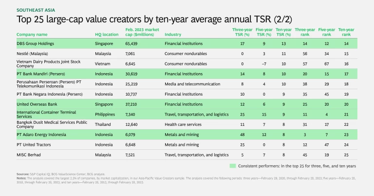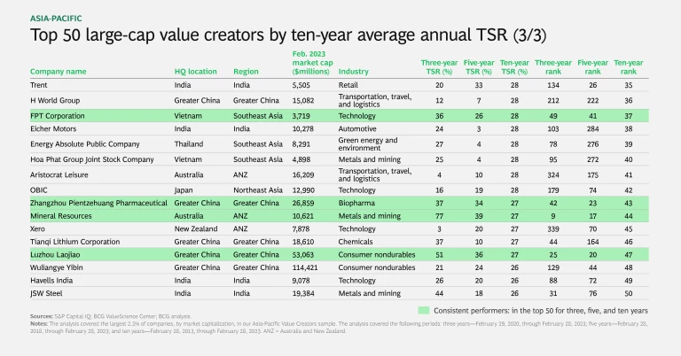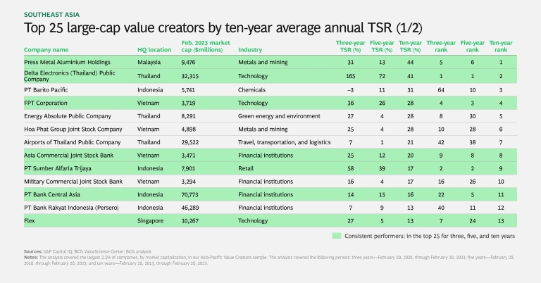 Although the subregion as a whole has underperformed, companies in Vietnam and Indonesia have delivered strong average annual TSR of 11% and 8%, respectively, driven by robust economic growth. In contrast, companies in Malaysia, Singapore, Thailand, and the Philippines have relied largely on cash payouts to shareholders and delivered an average annual TSR of approximately 4% to 5%. Throughout the subregion, companies in the technology and green-energy and environment sectors have achieved high annual average TSR. In addition, Southeast Asia is home to six of the top 50 Asia-Pacific large-cap value creators.