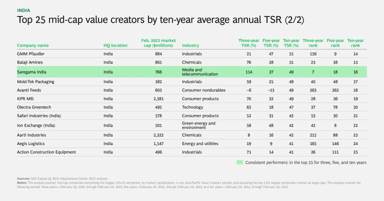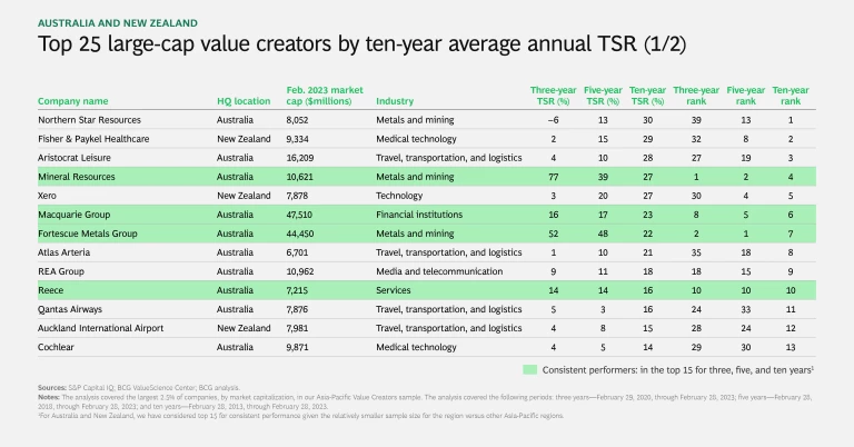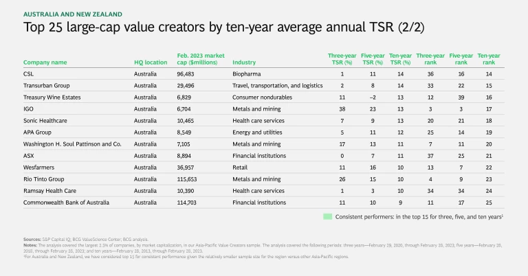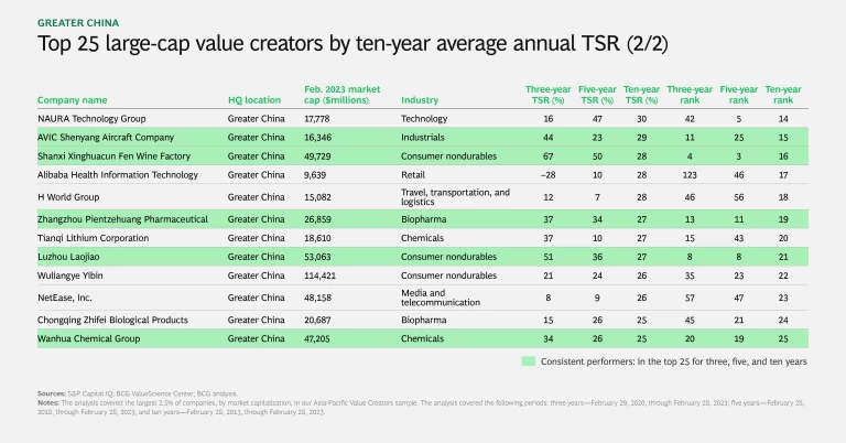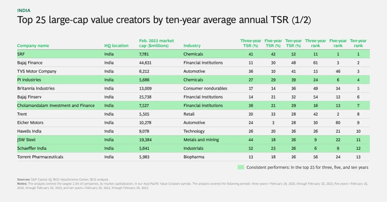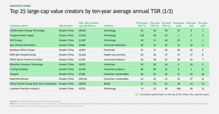 Companies headquartered in India and Greater China and from certain industries, such as technology and financial institutions, stand out as the Asia-Pacific region’s leading value creators. However, there are top performers from other subregions and sectors as well, indicating that any company can excel in value creation.