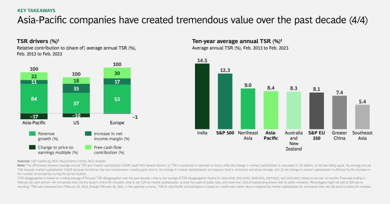 The Pursuit of Growth. Since 2013, Asia-Pacific companies’ revenue growth has contributed approximately 84% to total value creation, as measured by TSR, while increase in net-income margin has contributed only approximately 11%. This contrasts sharply with the US and Europe, where revenue growth contributes approximately 50% to 60% and increase in net-income margin contributes approximately 20% to 35%. Companies in developing markets, such as those in Asia-Pacific, can achieve above-average TSR by accelerating top-line growth. However, those in more mature global markets use a more balanced mix of growth, profitability improvements, and cash returns achieved through scale efficiencies, operational enhancements, and capital allocation, among other levers.
