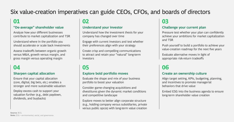 BCG’s TSR strategy framework provides tools for CEOs, CFOs, and boards of directors to align business, financial, and investor strategies to deliver strong and sustainable value creation over time. Page 12 of the slideshow outlines six distinct actions leaders can consider.
