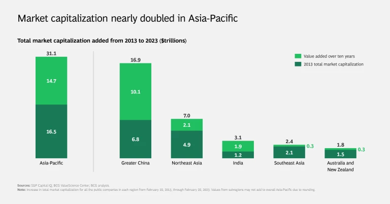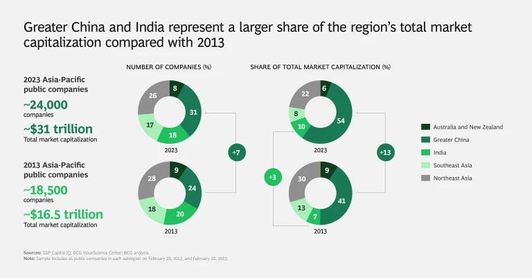 Market Capitalization. In 2023, the Asia-Pacific region had approximately 24,000 listed companies, with a combined market capitalization of approximately $31 trillion. Greater China accounted for 54% of the total market capitalization, followed by Northeast Asia (22%), India (10%), Southeast Asia (8%), and Australia and New Zealand (6%).