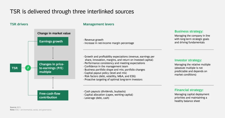 TSR. In our analyses, TSR is derived from three interlinked sources: earnings growth (which comprises revenue growth and changes in net-income margin percentage), changes in price-to-earnings (P/E) multiples, and free-cash-flow contribution yield (that is, dividends and share repurchases).