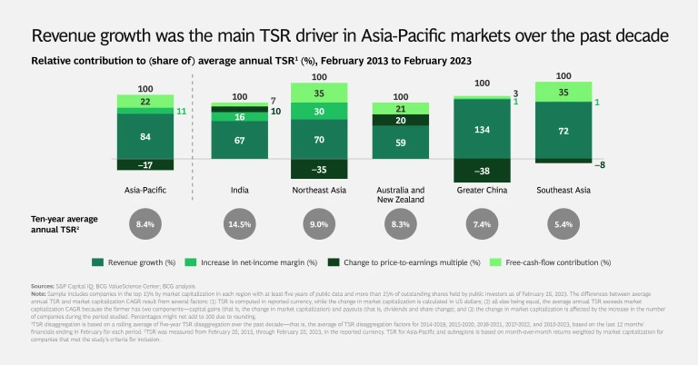 As Asia-Pacific markets mature, companies are likely to find that high revenue growth alone does not necessarily lead to high TSR. Understanding the relationship between growth and the other TSR drivers is essential to achieve strong and sustainable value creation in the medium to long term.