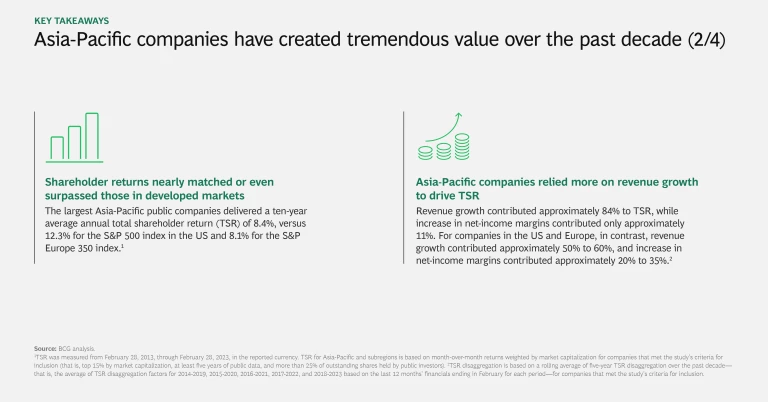Asia-Pacific companies have created tremendous value during the past decade. Market capitalization increased by $15 trillion, nearly doubling the size of the region’s equity markets. In comparison, market capitalization rose by $23 trillion in the US and by only $4 trillion in Europe. The largest Asia-Pacific public companies, based on market capitalization, delivered an average annual total shareholder return (TSR) of 8.4%, versus 12.3% for the S&P 500 index in the US and 8.1% for the S&P Europe 350 index.