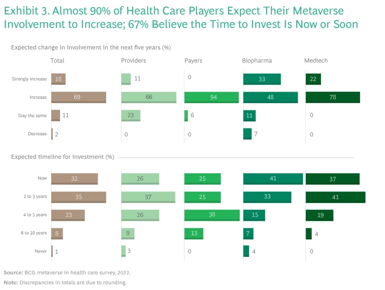 Perhaps most important, the number of enterprise strategies incorporating the new technologies is expected to grow in the coming years. Our survey found that 91% of health care executives believe the importance of the metaverse will increase, and 87% expect their involvement with the metaverse to rise. (See Exhibit 3.) Two-thirds believe it’s time to invest now or will be in the near future.
