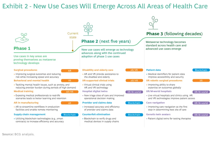 In phase two (the next five years or so), the health care metaverse will be defined by the broader adoption of current use cases and the emergence of new use cases as technologies advance. Phase three (the following decade) will see the development of more advanced use cases and the establishment of metaverse technologies across many areas of health care. (See Exhibit 2.)