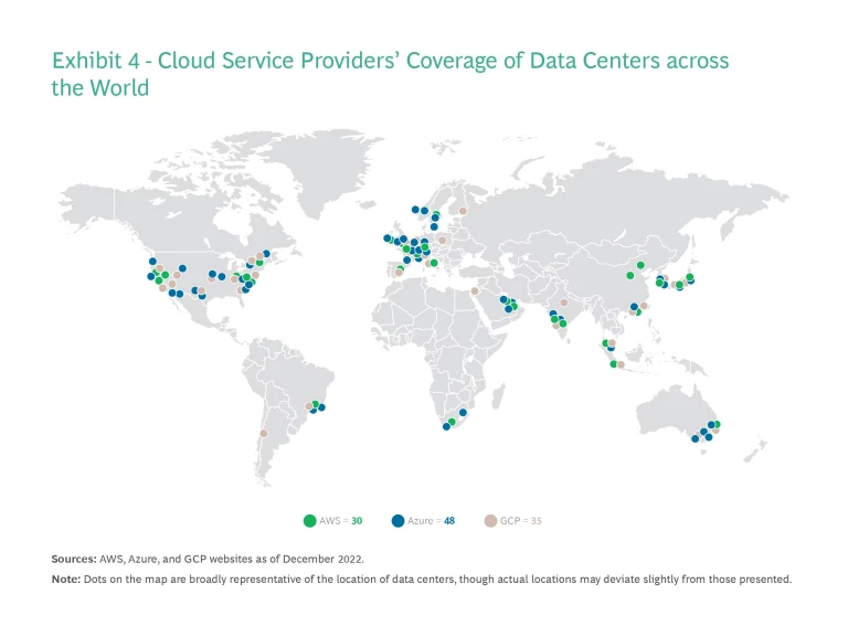 Cloud coverage is now comprehensive in critical commercial centers worldwide. (See Exhibit 4.) CSPs offer high bandwidth, optimized performance, compliance with local regulations, and robust disaster recovery. And because edge-computing use cases are on the rise, CSPs are extending their coverage closer to the data sources. (That said, it’s worth noting that not all cloud services are available in all regions.)