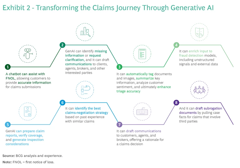 Efficient Claims Processing. Claims processing has traditionally been a time-consuming and labor-intensive task. GenAI can automate several stages of the claims journey, significantly reducing the time and effort required. (See Exhibit 2.) Typical use cases would include the preparation of standard mailings to claimants and the preparation of engagement letters to external service providers. This can enrich the role of adjusters by freeing them to focus on higher-value activities.