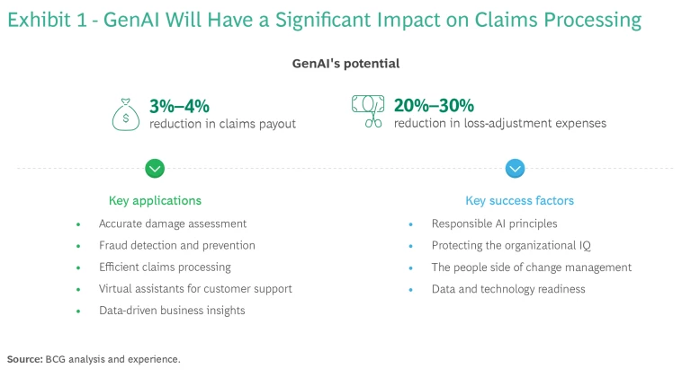 GenAI—coupled with machine learning, natural language processing, and other cutting-edge technologies—promises to enhance accuracy, efficiency, and customer satisfaction. While it is too early to assess the full potential of GenAI to reduce costs in the claims arena, we are observing substantial interest among nearly all large insurers to experiment.
