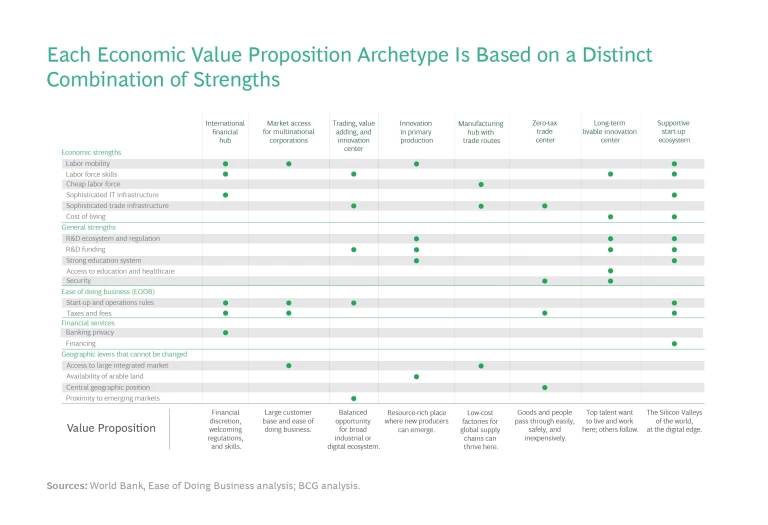 Typically, just a few value characteristics will stand out as truly distinctive for any country or city. For example, Switzerland has many attractive qualities as a place to live or do business, but only three are core to its position as a center of economic value. Ease of doing business in the country attracts many companies, particularly since it is so close to the European Union. The high level of banking privacy has made it a longstanding international hub for financial services. And Switzerland’s high talent level continues to attract innovative enterprises, especially in fields like pharmaceuticals.