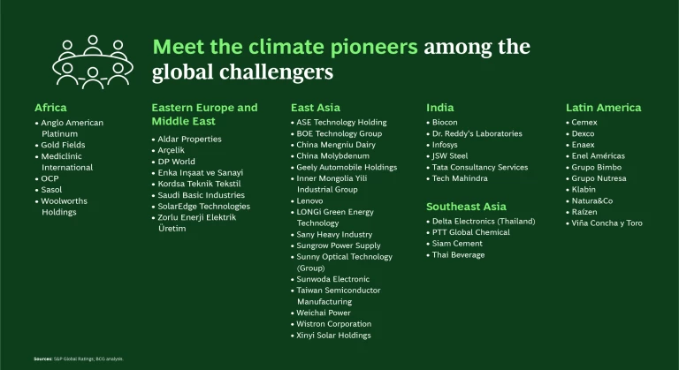 We found that certain large, high-growth emerging market companies perform well on both financial and environmental KPIs. And these high performers are found across industries and regions. We then compiled a representative list of 50 companies among the global challengers that we call “climate pioneers.”