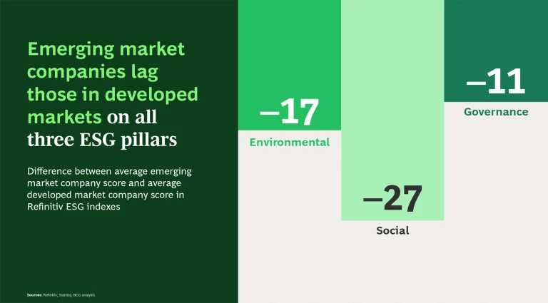 The challenge is that emerging market companies, as a cohort, significantly underperform companies in developed markets on all three ESG pillars, according to widely accepted rankings by various agencies. It’s not entirely fair, of course, to apply identical ESG criteria to high-income and low-income nations, which are at different stages of economic development and face different sets of urgent social challenges. Indeed, at the recent COP27 climate summit, developed-market governments recognized these special needs by establishing a “loss and damage fund” to help lower-income nations adapt to the impact of climate change and become resilient. But demands that companies rise to the ESG challenges in emerging markets are mounting at home as well, from investors, employees, customers, and other stakeholders. In fact, BCG research has found that emerging market consumers weigh climate change and sustainability in day-to-day decisions far more than consumers in developed markets do.