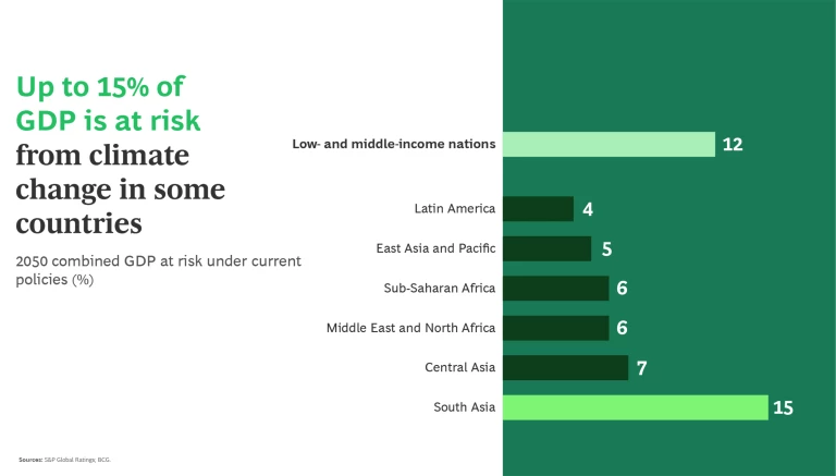 If climate change remains on its current trajectory, the impact will grow far more severe. Up to 6% of per capita GDP in Africa and the Middle East, 7% in central Asia, and 15% in South Asia is at risk by 2050 if climate policies remain unchanged, according to S&P Global Ratings.