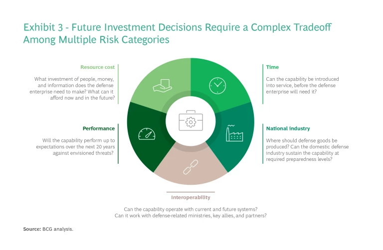 This strategy-led, resource-informed process—“force by design”—is key to understanding what the defense enterprise needs to invest in for the future. It also entails making informed tradeoffs among multiple risks. (See Exhibit 3.) The interplay of tradeoffs requires tight integration of activity among all elements of the defense enterprise during the force design process.