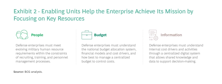 The second major component of a defense enterprise are enabling units, which provide the day-to-day services that enable the enterprise to fill its role in meeting national security objectives. These enterprise services are focused on three key resources: people, budget, and information. (See Exhibit 2.) Each needs its own high-functioning capabilities.