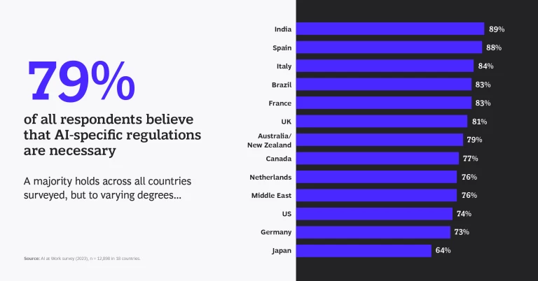 Despite their concerns, 71% of respondents believe the rewards of generative AI outweigh the risks. But they do want the risks to be managed: 79% of respondents support AI regulation. This represents a marked shift in attitude toward government oversight of technology. During the early days of the Internet, a laissez-faire, light-touch ethos prevailed. Today, employees are more willing to acknowledge that government can play a constructive role in overseeing a relatively new commercial technology.