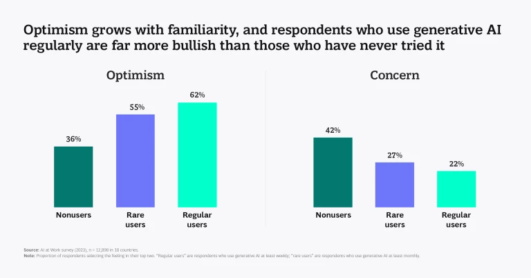 - Regular users of generative AI are much more optimistic than nonusers (62% vs. 36%).