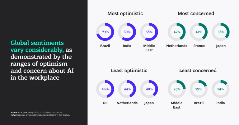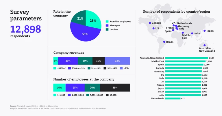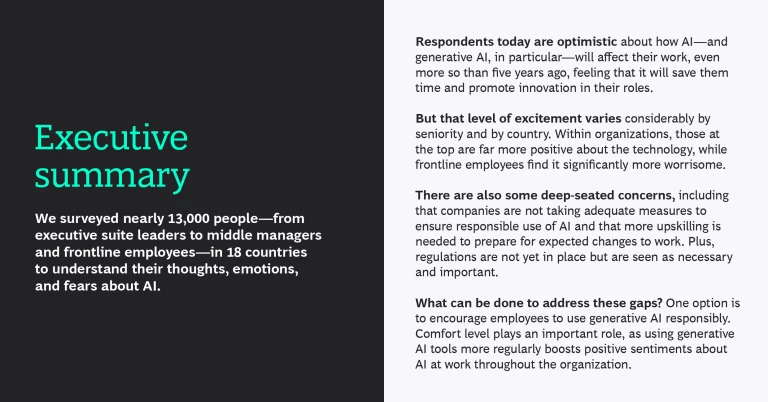 How do people in the workplace who have a front-row seat for the AI revolution feel about the technology sweeping across the corporate landscape? We surveyed nearly 13,000 people—from executive suite leaders to middle managers and frontline employees—in 18 countries to understand their thoughts, emotions, and fears about AI. They provided us with a number of insights: