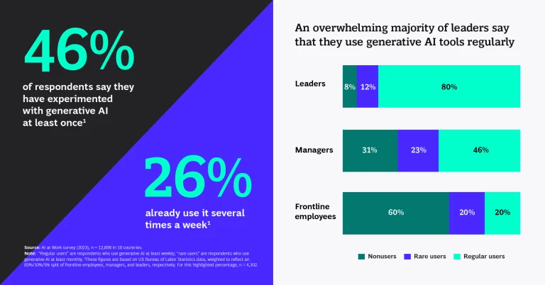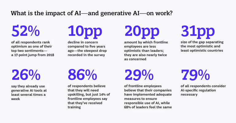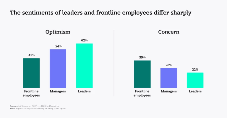 - Leaders are much more optimistic than frontline employees about AI (62% vs. 42%).