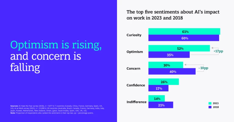 The average respondent today is far more optimistic and less concerned than the average respondent was five years ago—when we conducted a similar survey and when generative AI was still in the lab—but the average figure disguises two key differences among employee groups: