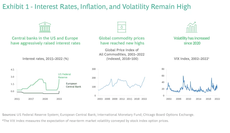 Recent challenges have brought balance sheet durability to the attention of CEOs and CFOs. Interest rates are at their highest levels in more than a decade, inflation continues to rise, and market volatility persists. (See Exhibit 1.)