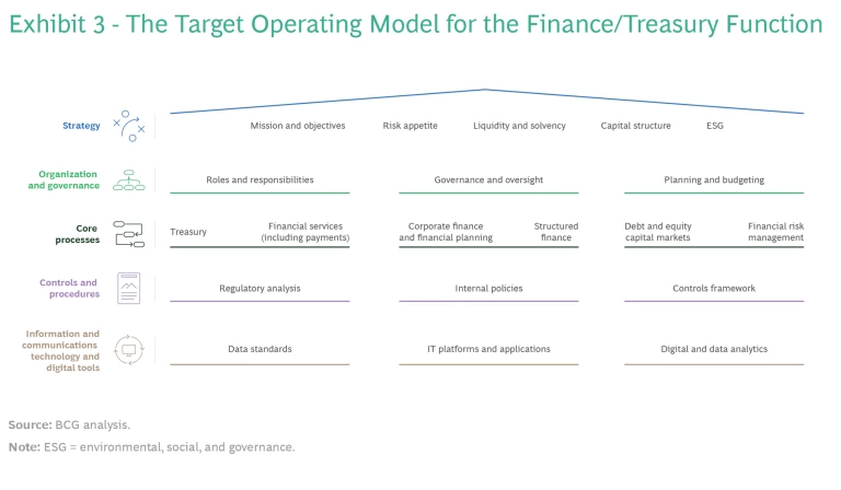 Finance/treasury functions need an operating model that gives them the mandate and capabilities required to optimize their balance sheets. In BCG’s experience, the target operating model should cover strategy, organization and governance, core processes, controls and procedures, and information and communications technology systems and digital tools. (See Exhibit 3.)