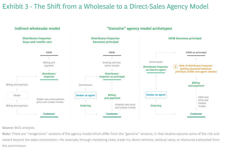 It’s still a developing environment, however, and in practice several OEMs have introduced "nongenuine" variations of the agency model. Here, regardless of whether the OEM or the distributor/importer is the principal, the agent assumes some of the risk and reward beyond the sales commission—for example, through marketing costs, trade-ins, demo vehicles, residual values, or discounts subtracted from the commission.