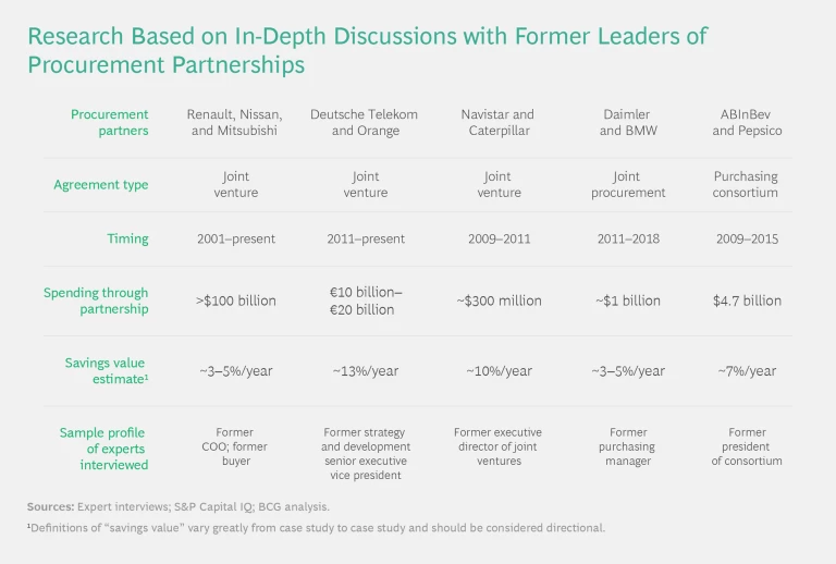 For this article, we analyzed five large procurement partnerships from the last decade to distill key lessons. Our research is based on in-depth discussions with leaders of procurement partnerships. The partnership examples are from automotive, telecommunications, construction equipment, and beverage sectors and include joint ventures, a joint procurement partnership, and a purchasing consortium. (See the exhibit.)