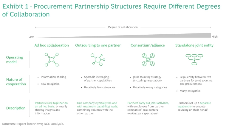 Pick the right partnership model. Joint procurement can follow any of four archetypical structures: a purely contractual collaboration; outsourcing to one partner; a formal procurement consortium; or a procurement joint venture—a new legal entity that provides procurement services to and acts as an agent for its parent companies. (See Exhibit 1.)