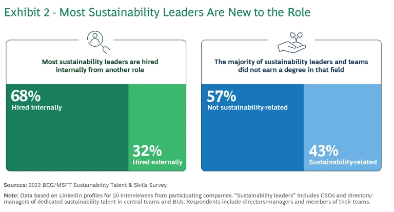 Among companies in the S&P 500 and FTSE 100, 52% now have a senior sustainability leader within the top two levels of the organization, an increase of 10 percentage points in the past year. (See Exhibit 1.) Our previous research also found that most sustainability leaders have been hired internally, and the majority do not have formal sustainability expertise. (See Exhibit 2.)