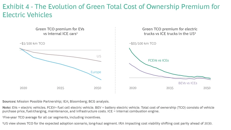Despite the formidable challenges to decarbonization, promising advancements in technology and manufacturing have been made. These advancements are increasing the economic viability and diminishing the so-called “green cost premium” of low-carbon technologies by driving down the costs of EVs, renewable fuels, and alternative propulsion systems. The transition to low-carbon alternatives is becoming more attainable for consumers and businesses alike. By 2030, most low-carbon technologies are expected to be economically viable worldwide. The rapidly declining cost of low-carbon light-duty land transport this decade, which accounts for the majority of emissions, signals that economically competitive transport solutions are imminent. (See Exhibit 4.)