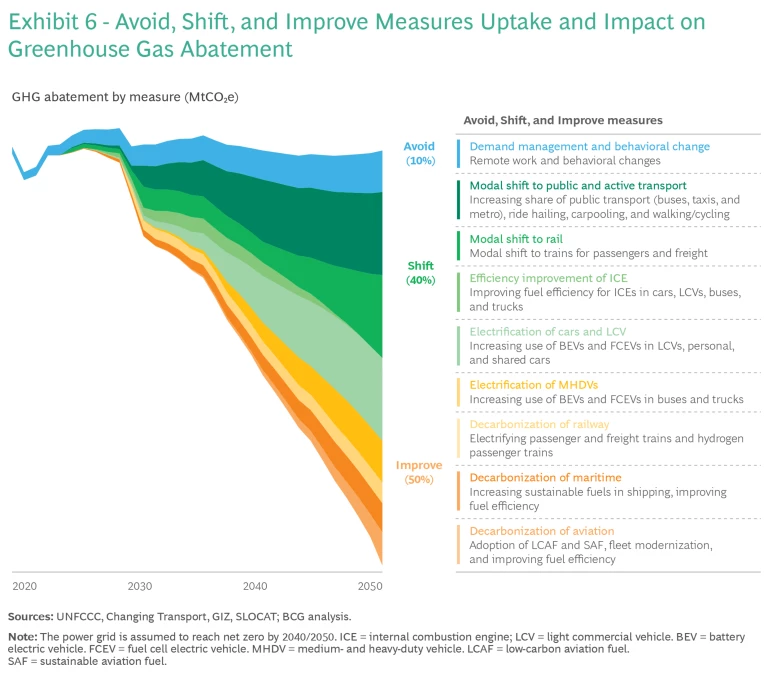 These ongoing efforts demonstrate how determined actions, supported by collaboration and policy implementation, can drive meaningful change in the transport sector. They reveal a robust framework to transport decarbonization focusing on three key steps: First, avoid unnecessary motorized travel and implement behavior change programs; then, shift to less carbon-intensive modes; and finally, improve the energy and carbon efficiency of vehicles. Measures to avoid and shift travel are especially effective and low cost in the long term and result in higher increases in well-being as co-benefits of GHG emissions reductions.