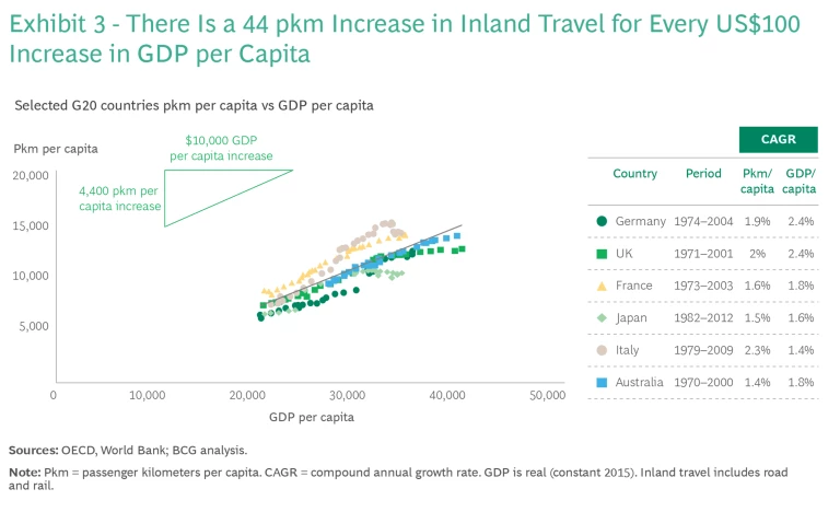 Economic prosperity in Global South countries will likely result in higher transportation demand. Historically, for every $100 increase in GDP per capita in high-income countries, there has been a corresponding increase in inland travel by 44 passenger kilometers (pkm) per capita. (See Exhibit 3.) High-income countries have managed to decouple income growth from transportation demand growth to an extent through effective policy measures, modal shift initiatives, and investments in sustainable transport and cities. However, economic prosperity in the Global South will likely result in an even higher growth rate of transportation demand. For instance, passenger demand is expected to more than triple in sub-Saharan Africa and more than double in Southeast Asia by 2050. Considering that the carbon intensity of transportation lags vehicle sales by 10 to 15 years, quickly decoupling income growth from transportation demand in the Global South is essential to prevent future emissions surges. This effort will require further cross-country collaboration, targeted policies, and investments in sustainable infrastructure.