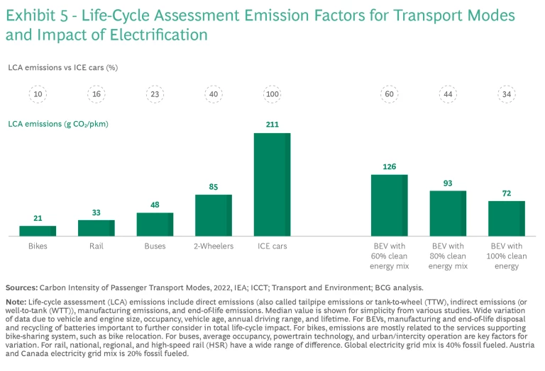 Step 2: Shift. Modal shifts to less carbon-intensive transport are crucial to decarbonization efforts. Promoting collective transport such as trains or ridesharing and expanding public transport networks significantly reduce emissions. Car-sharing schemes, whether point-to-point or free-floating, also lead to reduced car ownership. Studies indicate that 5 to 15 cars could be replaced for each shared car added to a country’s fleet—an example of how one strategy can lead to both Shift and Avoid