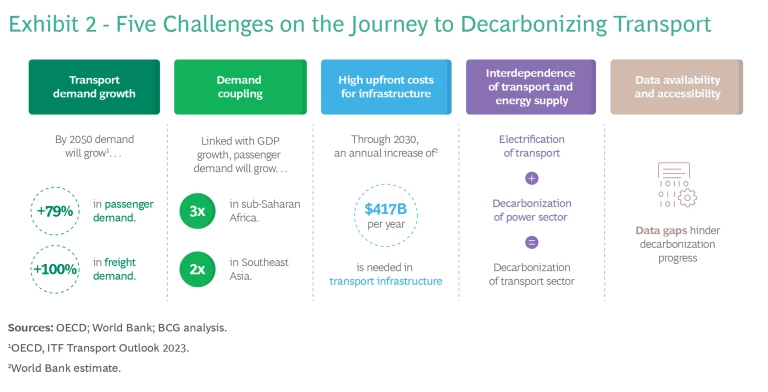 The transport sector’s size and diversity make it challenging to decarbonize, particularly in aviation, shipping, and heavy transport. Common across geographies are the following five challenges. (See Exhibit 2.)