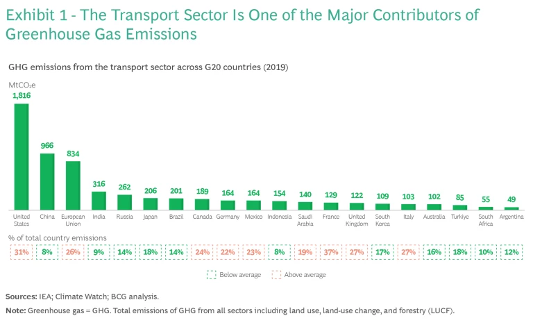 Exhibit 1 highlights the magnitude of transport sector emissions in some of the world’s largest economies. The sector accounts for well over a quarter of all emissions in the economies of North America and Europe. It is the largest emitting sector in the United Kingdom and the United States; in the European Union and the Kingdom of Saudi Arabia (KSA), it is the second largest.