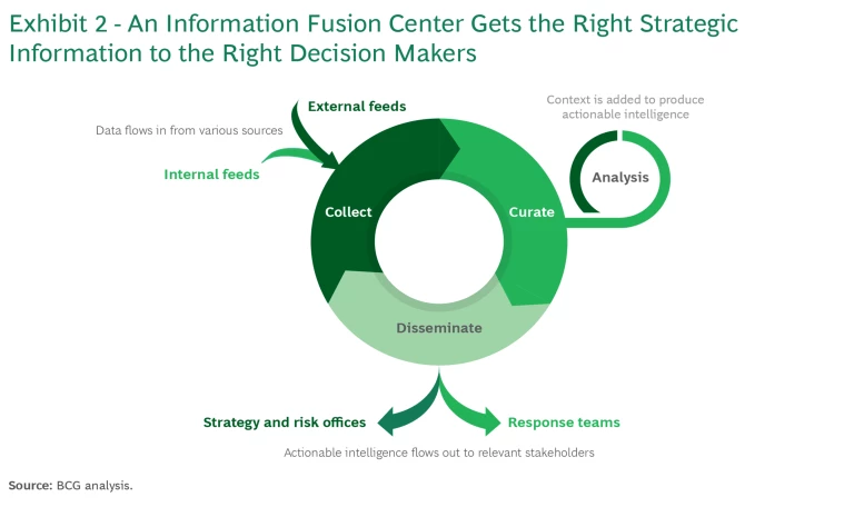 To house and help implement this capability, companies should have a centralized hub—an “information fusion center”—where various data streams converge to generate risk intelligence. (See Exhibit 2.) The center informs strategic decision making by collecting raw data from the organization’s key strategic nodes, curating and transforming it into contextualized information, and then disseminating actionable intelligence back to decision makers.