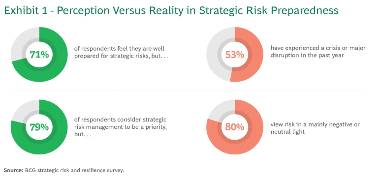A recent BCG survey found that nearly three-quarters of senior executives have confidence in their company’s strategic risk management capabilities. (See “About the Survey.”) At the same time, however, most have experienced impacts from increasingly frequent and severe disruptions, such as cybercrime, technological changes, or various industry-specific events.